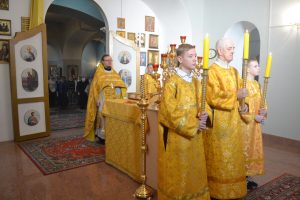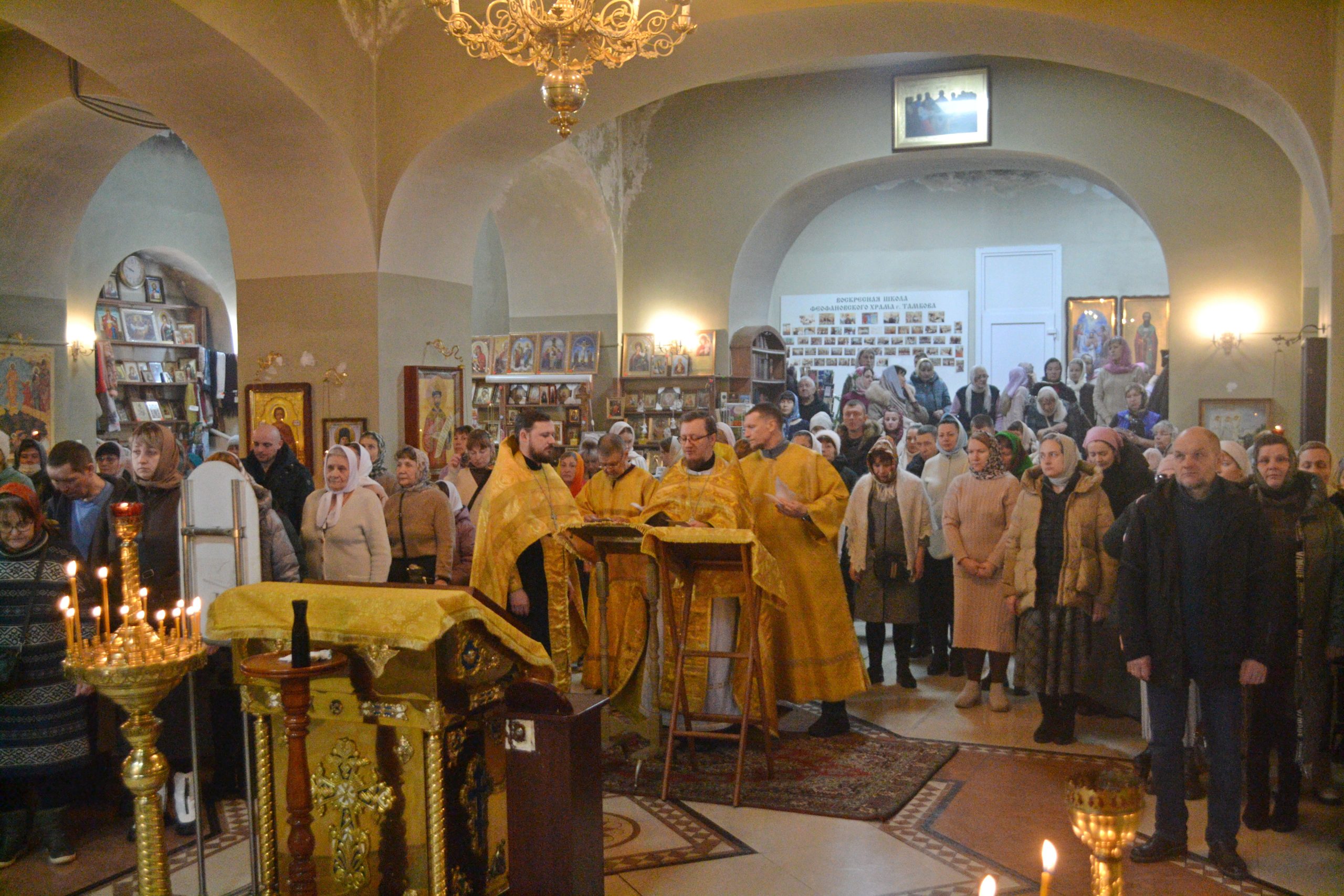 22 февраля 2026 года, в Неделю сыропустную, воспоминание Адамова изгнания (Прощеное воскресенье), день памяти обретения мощей святителя Тихона, патриарха Московского и всея Руси, в храме в честь святителя Феофана Затворника Вышенского была совершена Божественная литургия.
